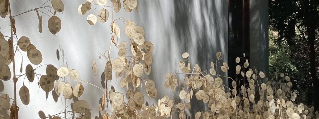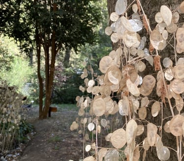Con el tiempo, las lunárias, ocuparon gran parte del jardín. Su apariencia cambia según la temporada. Durante un año, crecen verdes; En el segundo, florecen y dejan ver sus frutos plateados.